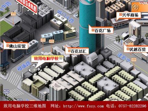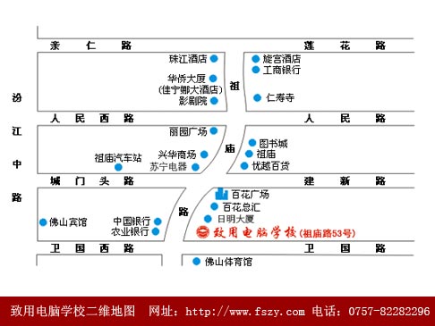 我校位于佛山市经济文化中心——禅城区祖庙路53号(百花广场往顺联百花总汇方向200米),面积1000多平方,分布在一楼、二楼、三楼。交通便利,环境优越,设备齐全。有空调电脑课室8间,专业电脑100多台(每年紧跟科技形势不断更新)、打印机(彩色激光打印机)、高分辨率扫描仪等设备,硬件配置完全满足教学要求。